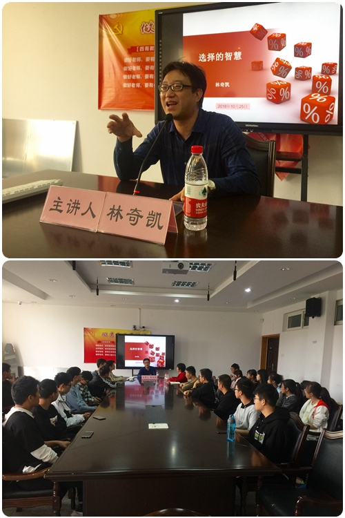 讲座开始前,林书记首先耐心倾听了同学们初入大学的困惑和焦虑,随后,就同学们关心的考研、出国留学、入党、青年志愿者活动、课外竞赛活动等问题一一做了解答。讲座中,他讲到大学生“首先要去适应角色的转变”,然后学会去选择,“选择的主体是自己,选择的前提是认识自己”。在选择过程中我们要学会“处理好内在和外在之间的关系”。他用一个个生动有趣、鲜活的例子,和在场同学分享了如何培养良好积极的心态,同时分析了影响选择的各类因素,诠释了如何培养选择的智慧,提高选择的能力。