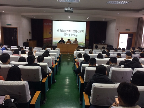 3月5日中午,太阳城娱乐 在信息楼五楼报告厅召开了本学期学生干部大会,太阳城娱乐 院长助理严水英、学工办主任孙文静、团委书记汪小静以及各学生组织主要负责人,各班班干部100余人参与了会议。 本次会议是新学期的第一次大会,首先就开学初的安全稳定、诚信补考、寝室卫生大扫除等相关工作了做了布置,随后也对本学期的学生工作思路和重点做了沟通与传达,为本学期各项工作的有序开展奠定了基础。