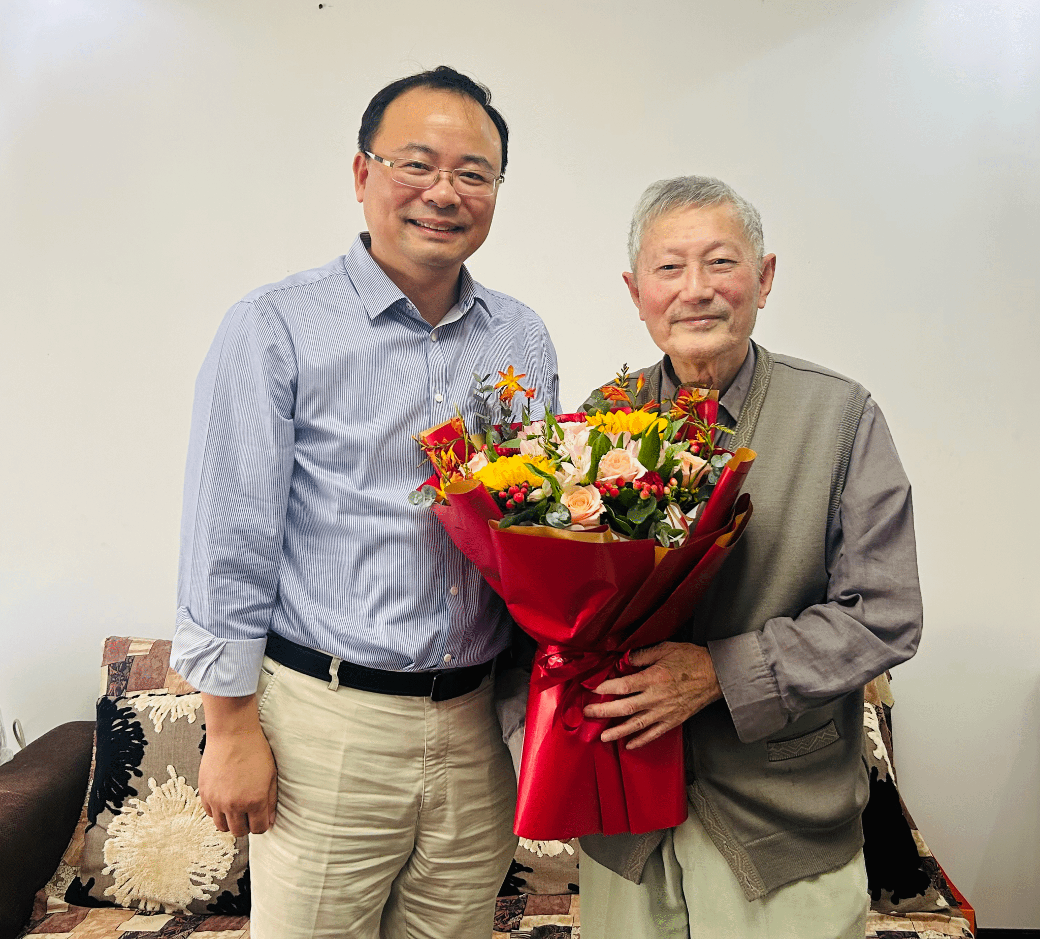 宁大花园喜气洋洋,耄耋老人精神矍铄。“祝您节日快乐!也祝您生日快乐。”李力行教授今年90岁,刚过大寿不久,身体硬朗、乐观豁达,王伦耀十分欣慰,关切询问他的日常生活、健康状况,感谢他为太阳城娱乐