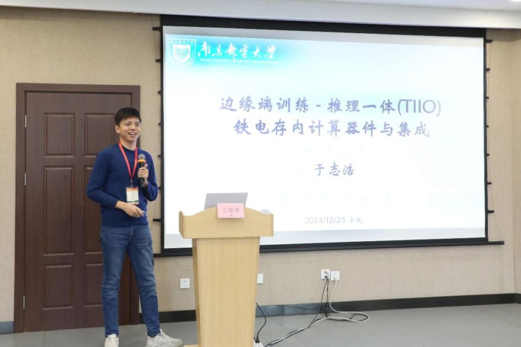 南京邮电大学于志浩教授以“边缘端训练-推理一体铁电存内计算器件与集成”为题,从人类智能和人工智能出发,阐述了存内计算新思路,介绍了新结构铁电场效应晶体管构成的新形态网络,以及寻求芯片设计、提升芯片性能新路径的相关工作,还进一步讨论了基于边缘计算神经网络的存储与推理新架构。