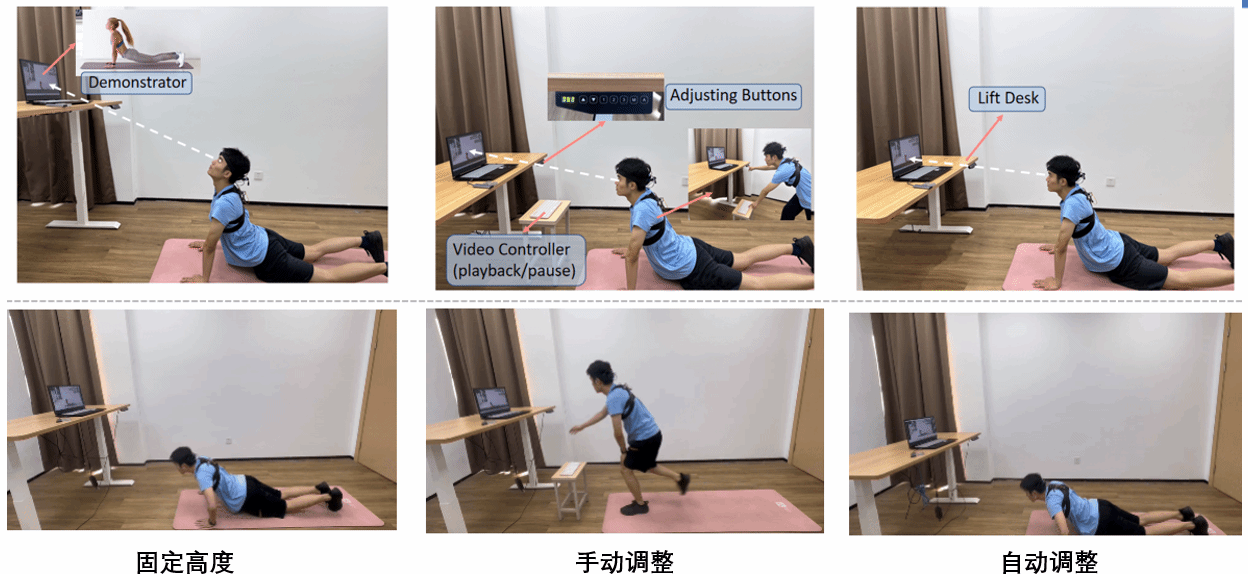 为了测试评估自适应升降的实际效果,我们对比三种不同的桌面高度变化方式:固定高度、手动调整、以及智能调整。我们安装了肌电传感器到用户的颈部,并实时记录其肌肉紧绷状态,用来评估不同的升降方式对于用户颈部肌肉的影响。实验表明:使用自适应升降可以有效缓解颈部肌肉的紧绷程度,让用户时刻保持健康的姿态,提升用户体验。图1给出了该系统的展示,该成果被人机交互领域顶会(CCF-A类)CHI 2024接收,相关内容发表其他CCF-B类以上期刊和会议4篇,支持2项团体标准的申报,已申请专利10余项目。