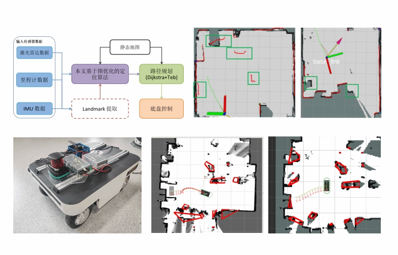 针对移动机器人在执行定位导航任务中激光雷达外参标定问题,研究Scan-to-Map匹配的激光雷达外参标定方法,通过改进激光雷达自身位姿估计求解和移动机器人里程计航迹推算来提高标定精度。针对定位问题,利用环境中建筑物结构特征(Landmarks)替代人工路标的定位方法,利用激光雷达传感器的扫描数据来提取环境中的建筑物结构特征,并添加到全局位姿优化过程中,提高移动机器人在复杂动态环境中的定位精度。针对四舵轮移动机器人,通过添加四舵轮约束、路径模式分段规划等方法,采用多模式时间弹性带算法MMTEB(Multi-Mode Timed Elastic Band),有效地发挥了四舵轮底盘的优势。