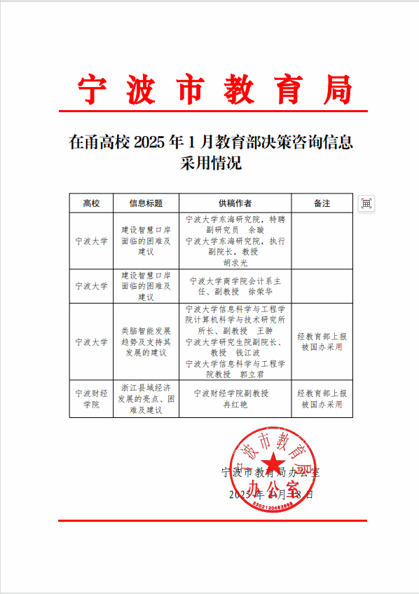 近日,宁波市教育局办公室通报2025年1月教育部决策咨询信息采用情况,太阳城娱乐