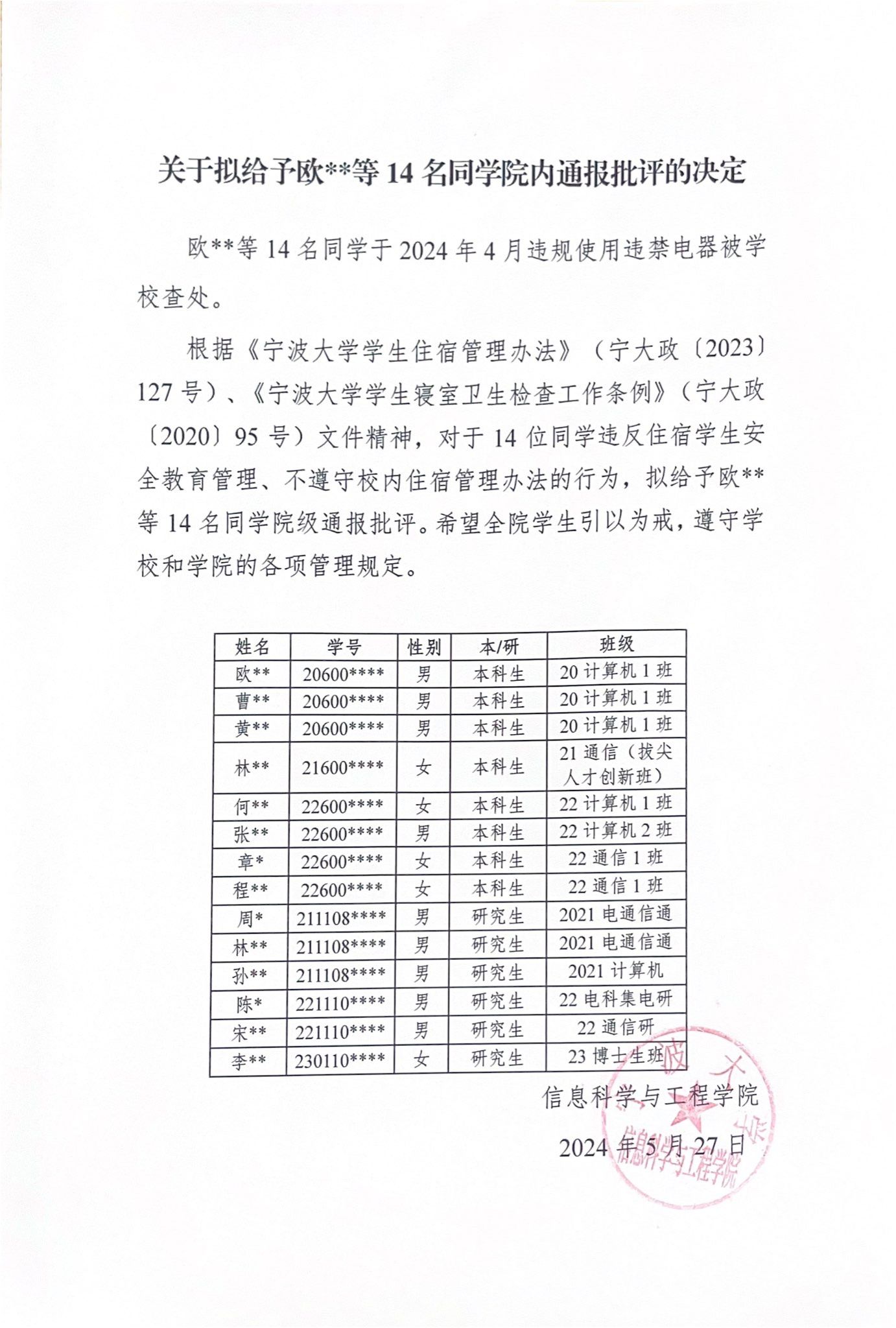 关于拟给予欧**等14名同太阳城娱乐网 内通报批评的决定