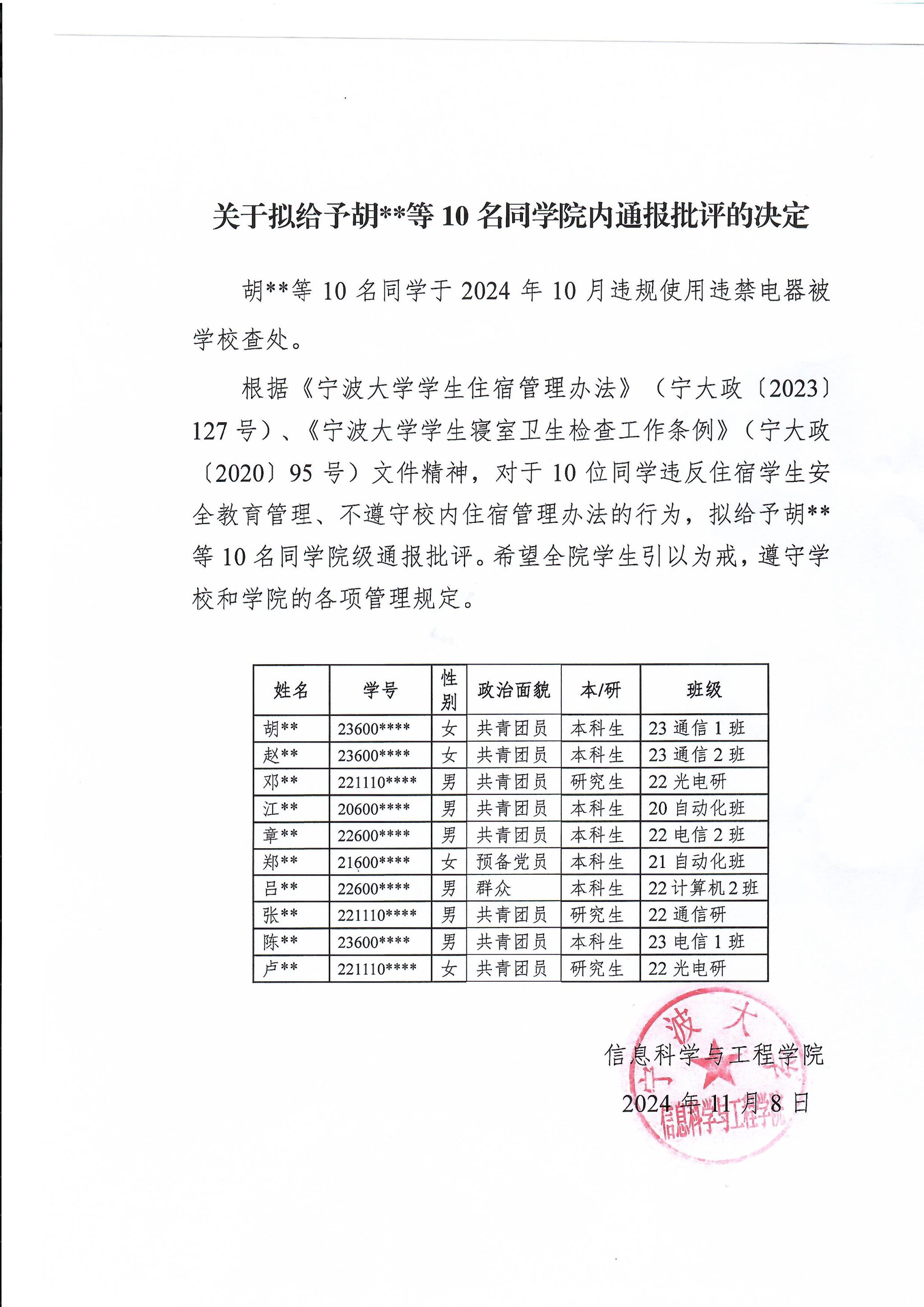 关于拟给予胡**等10名同太阳城娱乐网 内通报批评的决定