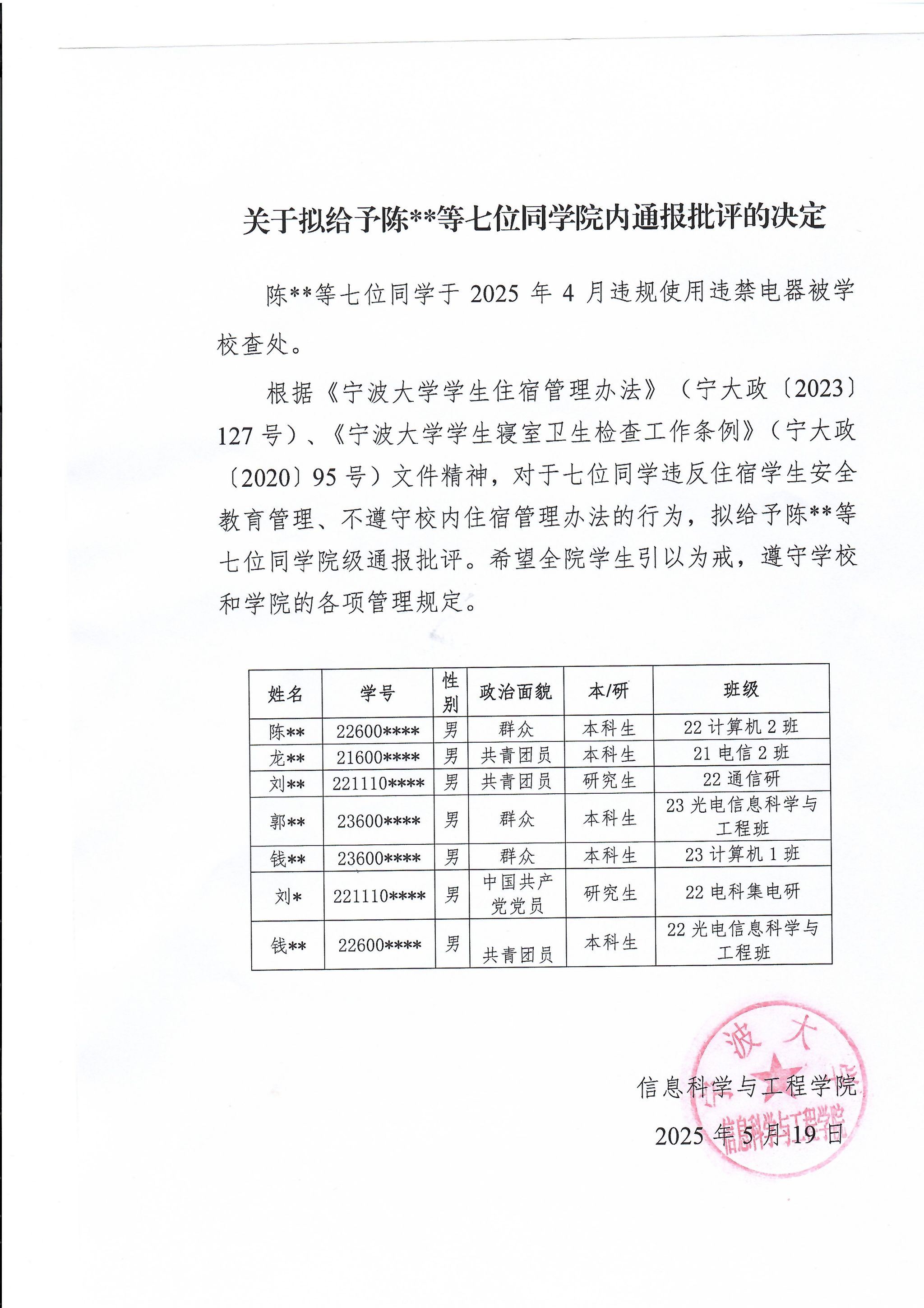 关于拟给予陈**等七位同太阳城娱乐网 内通报批评的决定