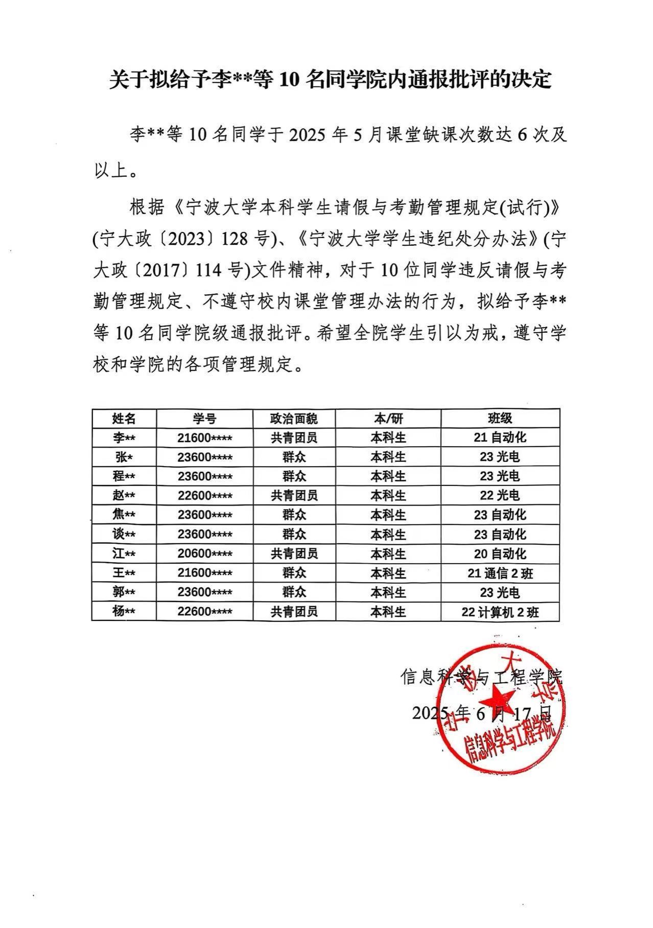关于拟给予李**等10名同太阳城娱乐网 内通报批评的决定