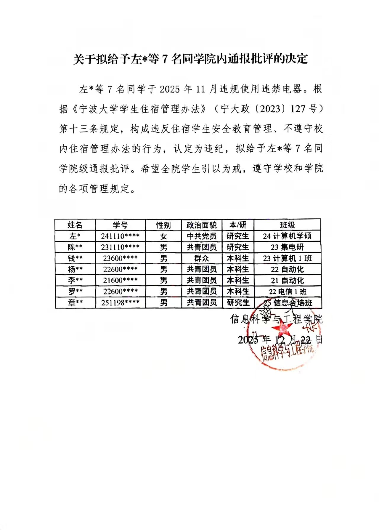 关于拟给予左*等7名同太阳城娱乐 内通报批评的决定