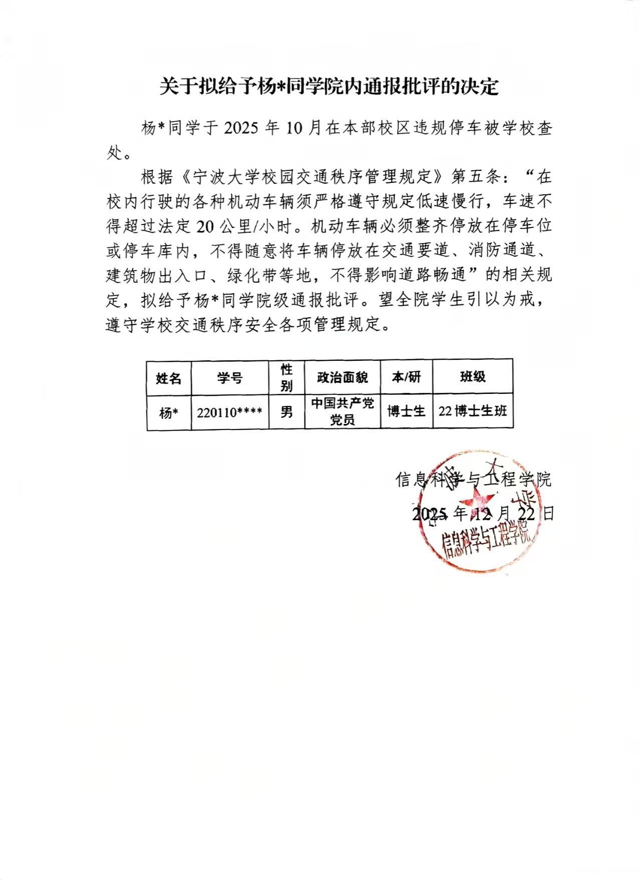 关于拟给予杨*同太阳城娱乐 内通报批评的决定