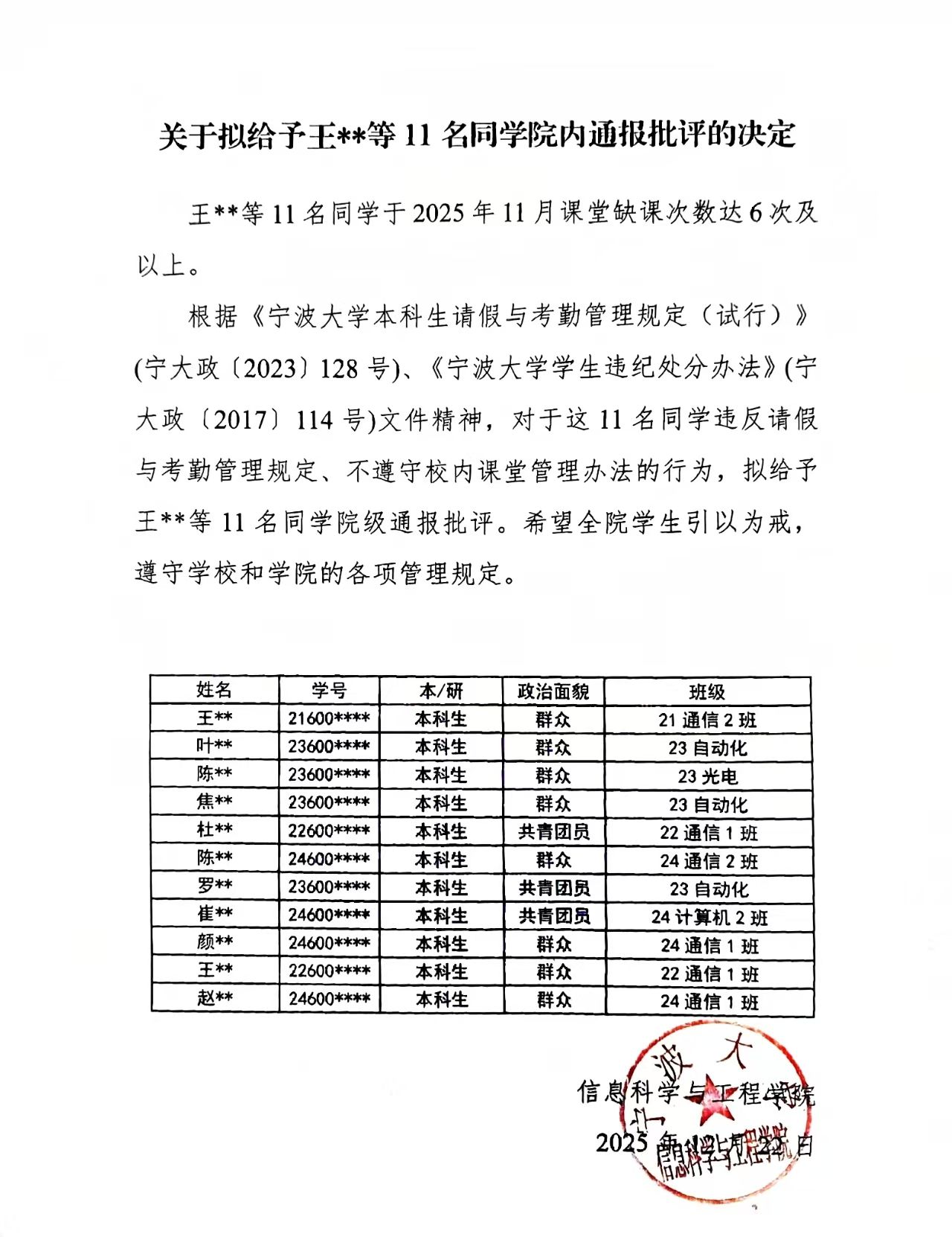 关于拟给予王**等11名同太阳城娱乐 内通报批评的决定