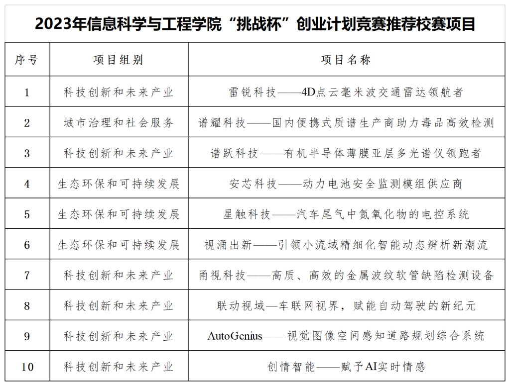 经团队申报、学工资格审查和线下评审环节,太阳城娱乐网 拟推荐以下10个项目参加2023年太阳城娱乐网 “挑战杯”大学生创业计划竞赛,现予以公示(见下图)。公示期至2023年11月27日,公示期如有异议请联系学工办史远,shiyuan@tycylccn.com/667131。
