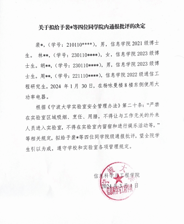 关于给与XX等四位同太阳城娱乐网 内通报批评的决定