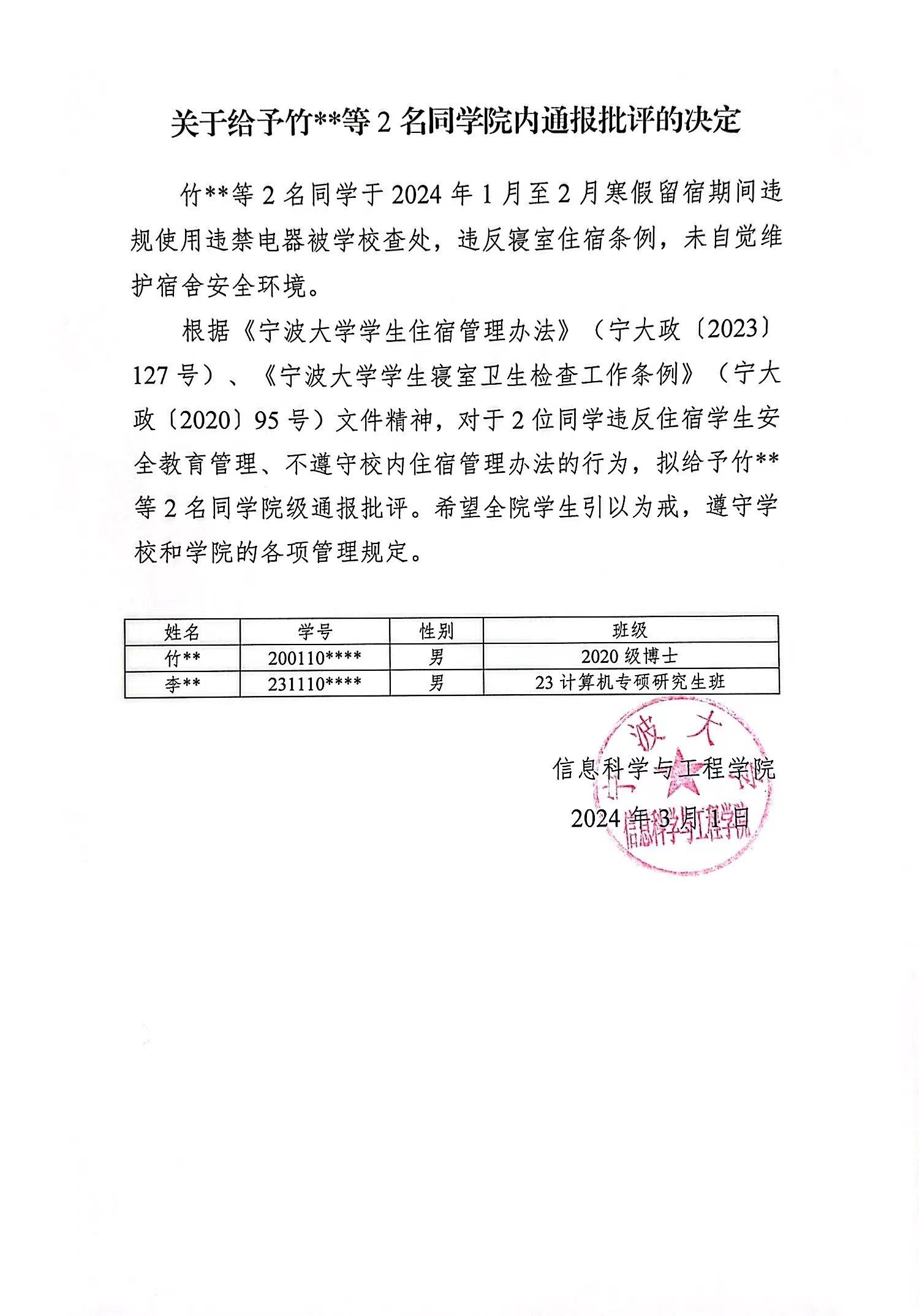 关于给予竹XX等2名同太阳城娱乐网 内通报批评的决定