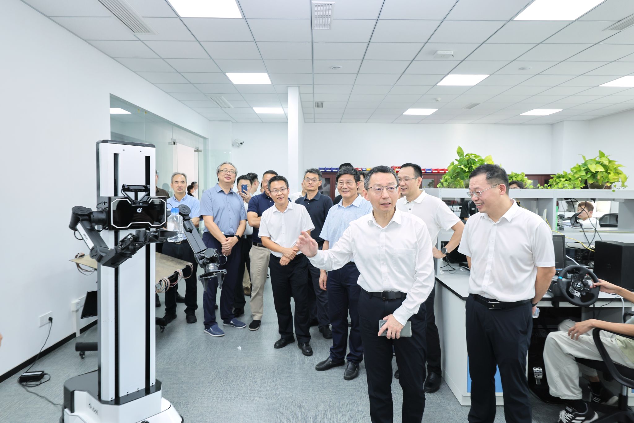 史旭华教授领衔的智能制造与数字孪生团队介绍了团队在人形机器人及具身智能方面取得的技术成果,了解到团队在身智能机器人、无人机控制系统开发设计等方面成果突出,并在国家电网、极氪汽车等企业进行成果转化应用。徐岩对上述团队取得成果给予肯定。